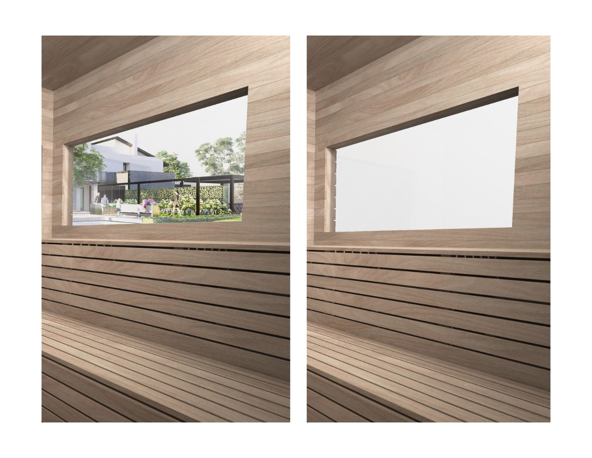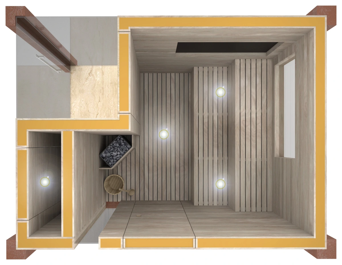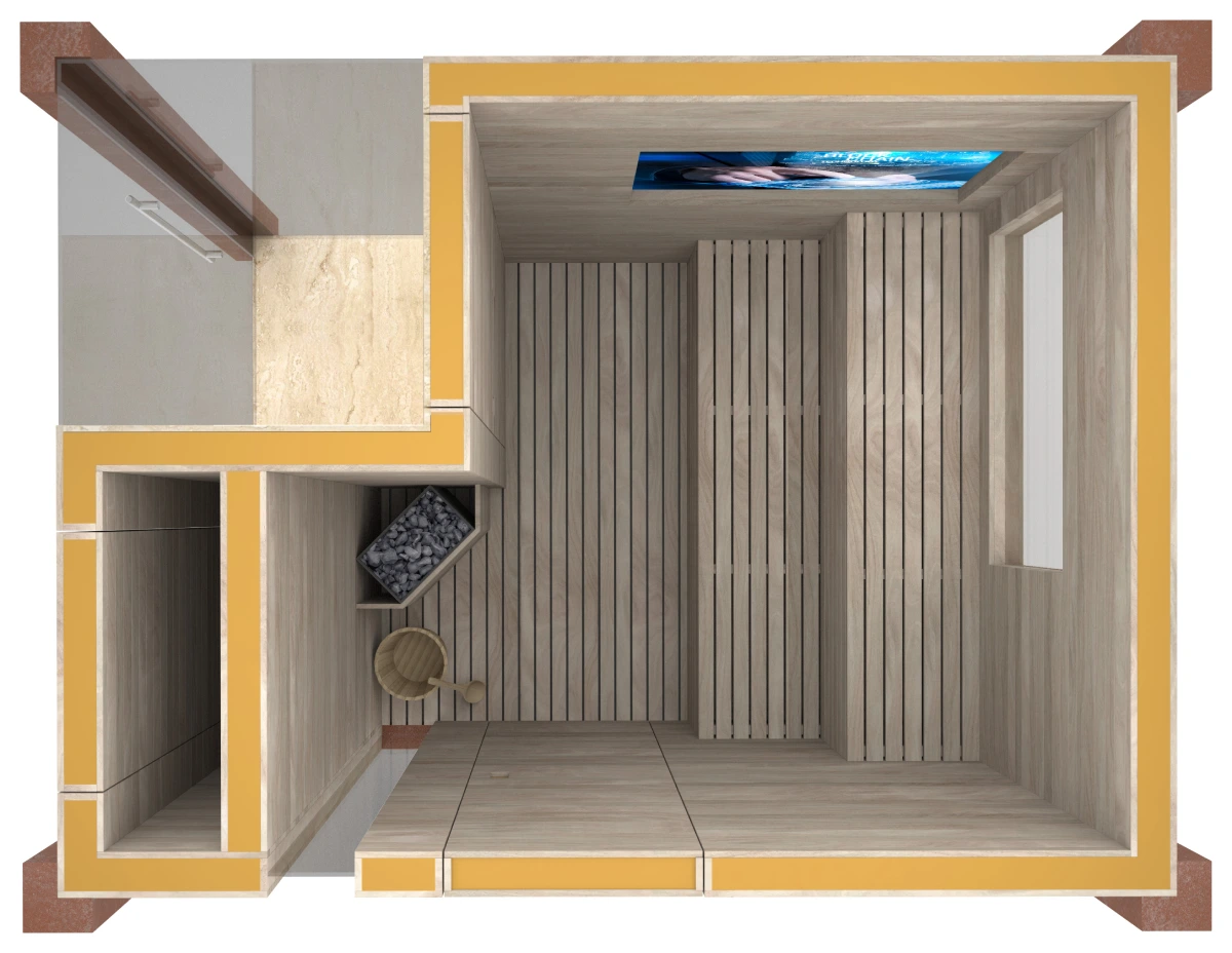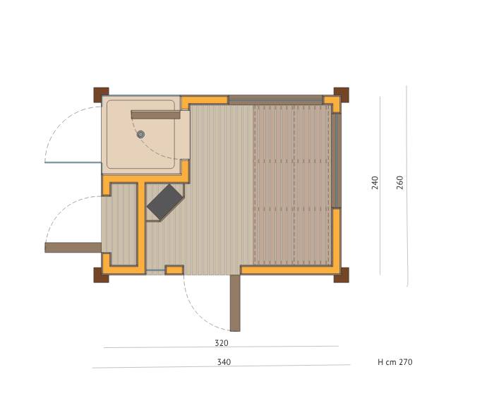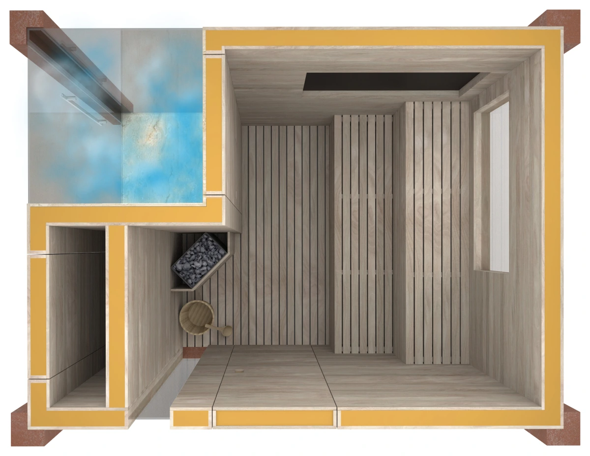 I modelli 24&32 includono inoltre un box doccia da 100 x 100 cm, con apertura sia verso l’esterno che dall’interno della sauna, rifinito con un effetto pietra naturale.